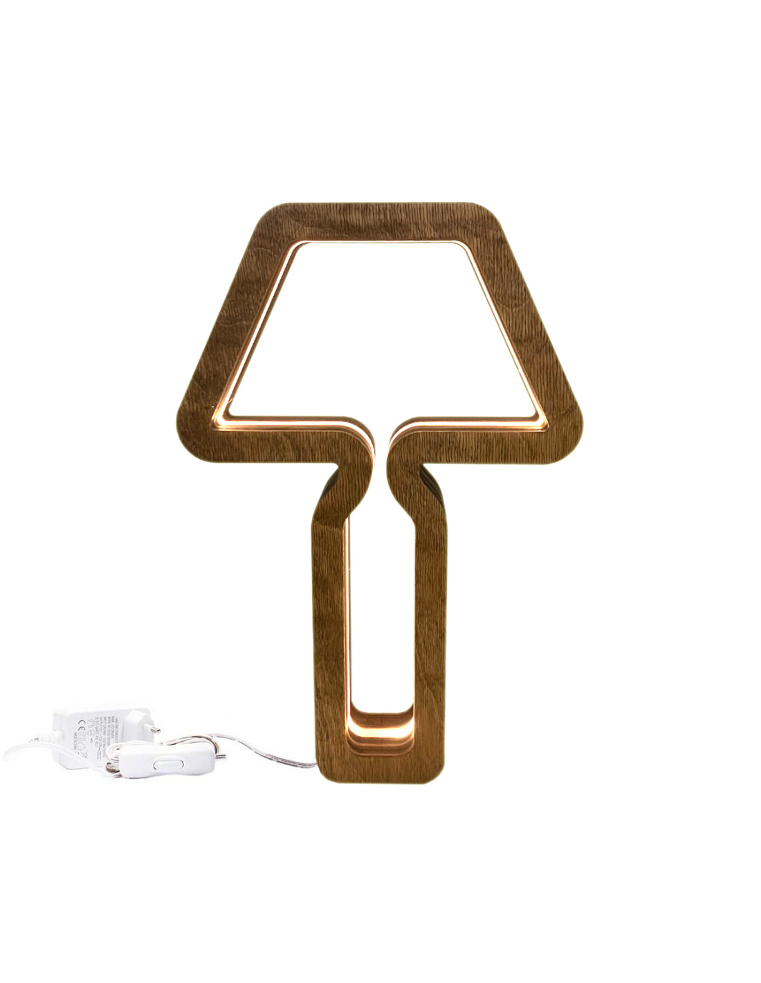 La lampada da tavolo Stappa e illumina è realizzata con cinque sagome di betulla finemente tagliate al laser e assemblate attraverso un alloggiamento progettato per ospitare una striscia LED a luce calda.