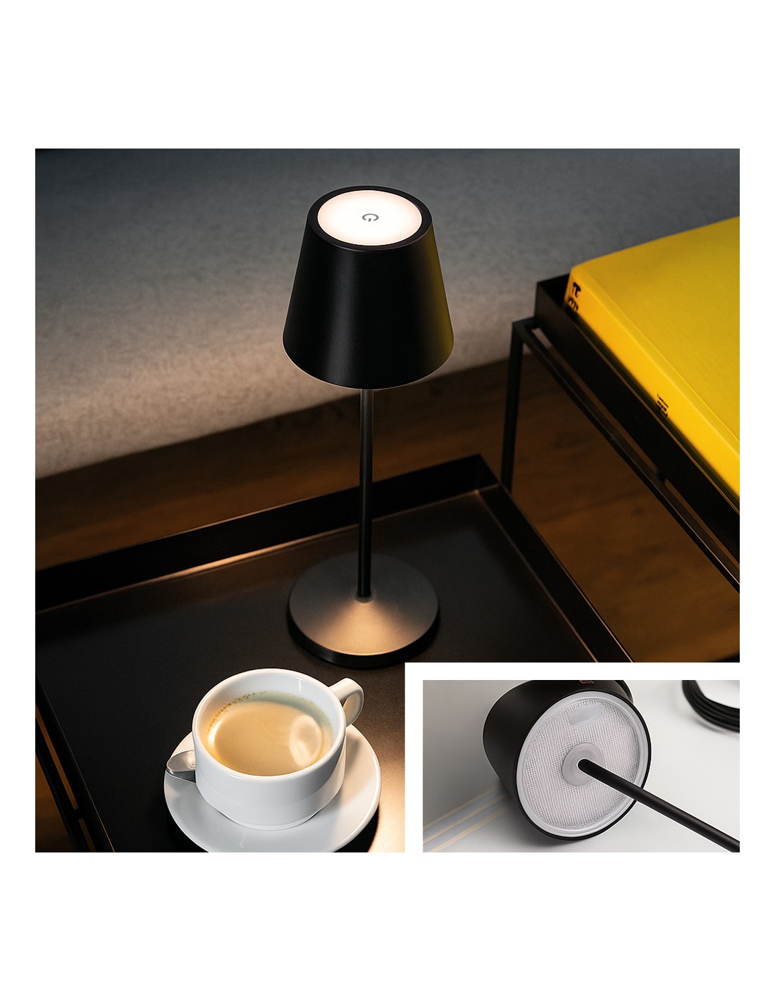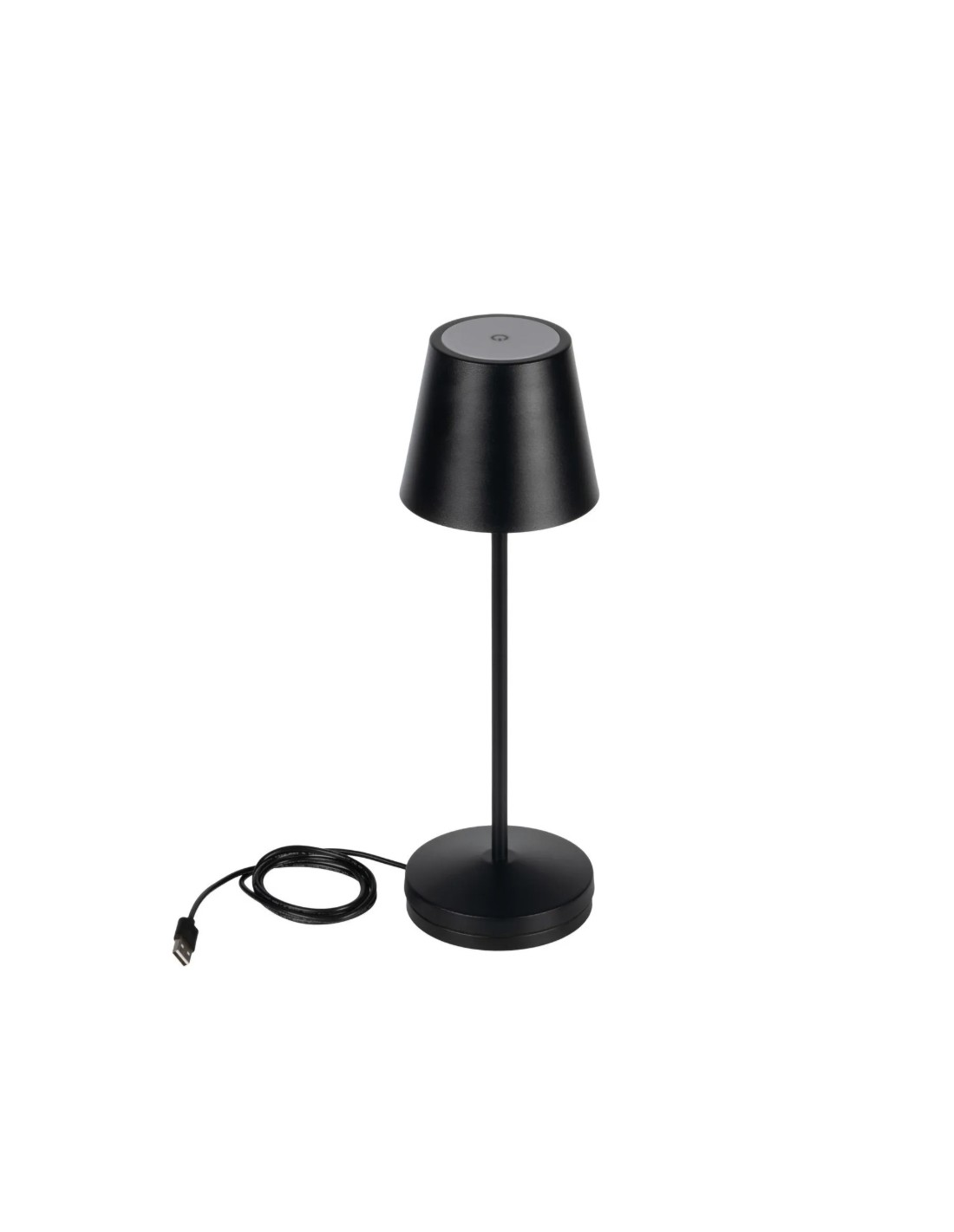 La lampada da tavolo INITA LED combina design minimalista e moderno con una struttura in metallo nero, perfetta per terrazze, comodini e tavoli da giardino.